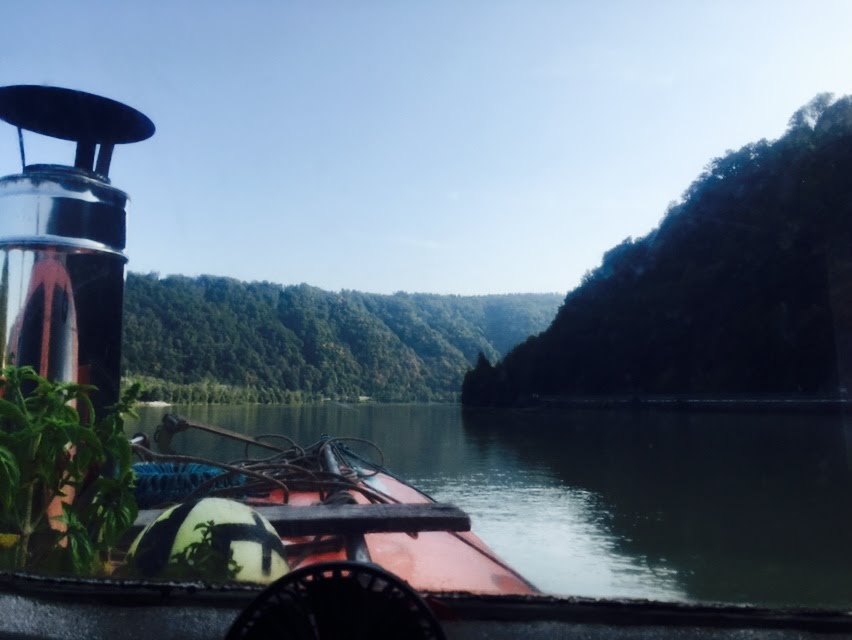 Passau is the last of the German towns, but again, all mooring places are reserved for the big cruise ships and we end up spending the first Austrian night moored alongside a big rusty barge that was anchored off the navigation channel.